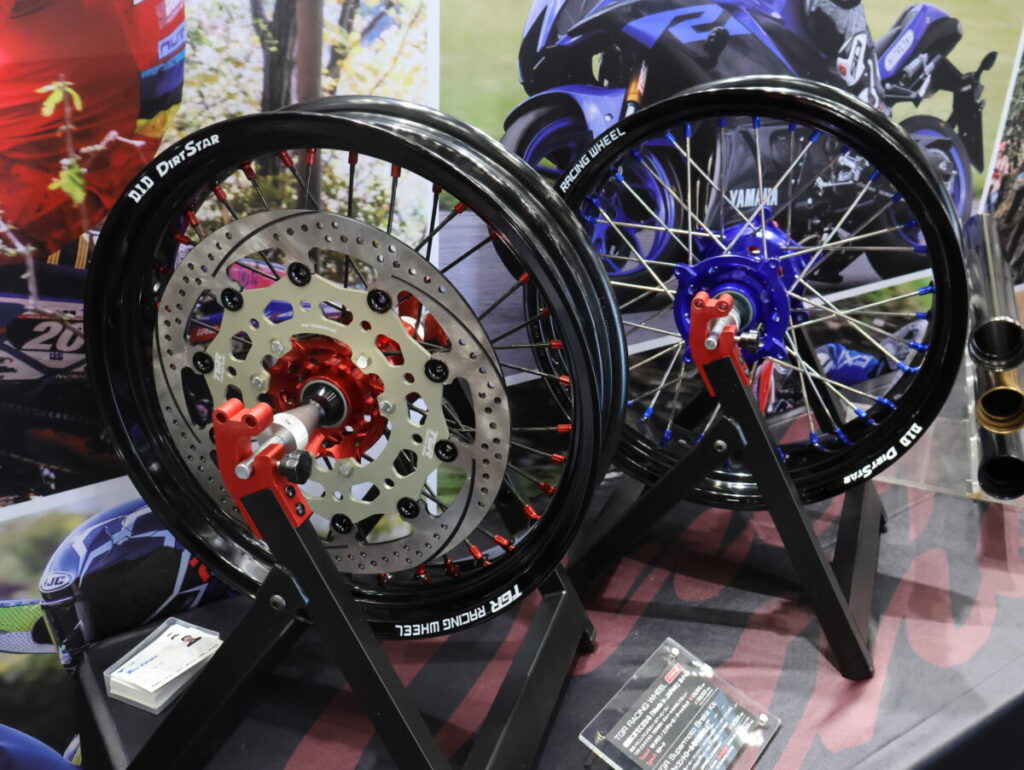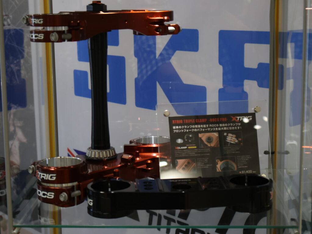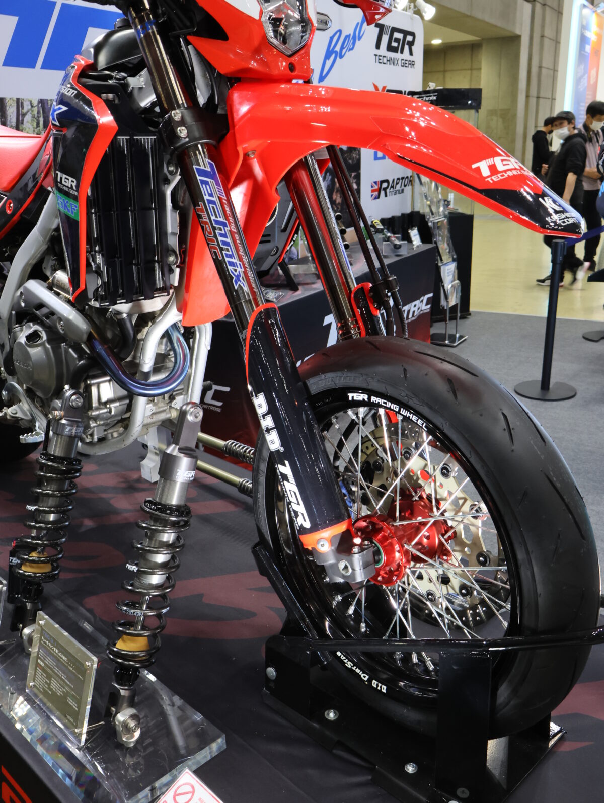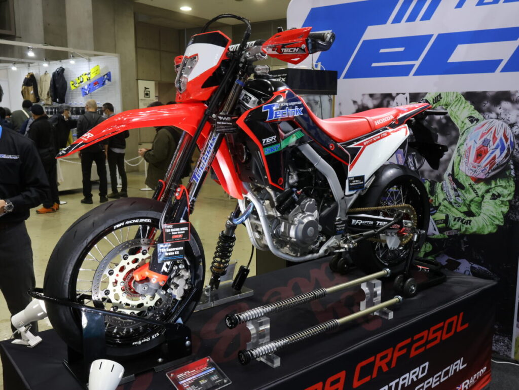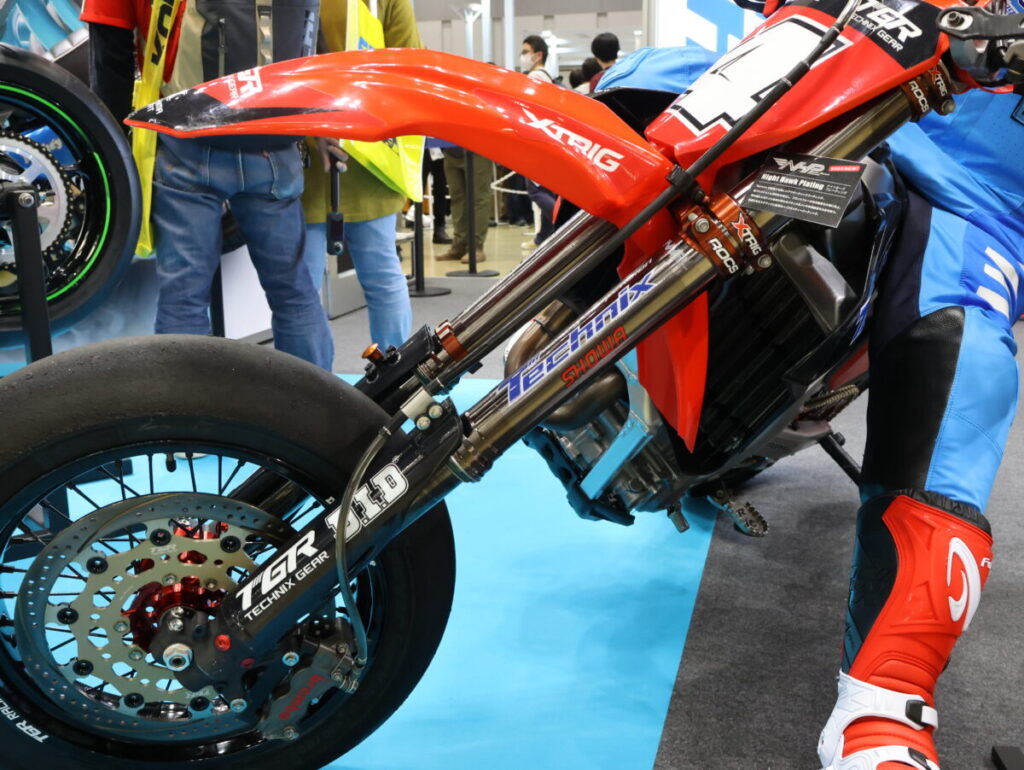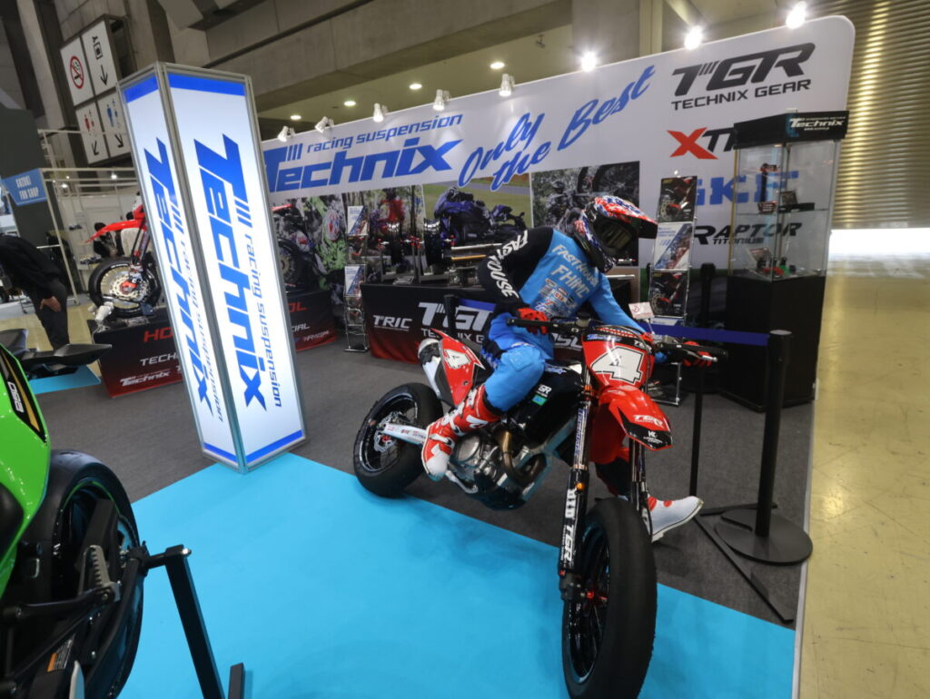 このほかテクニクスブースでは、トレールバイクやモトクロッサーをスーパーモタード化する際に必要な、17インチホイールや大径ローターのブレーキシステム、トレール量の変更が可能な高強度トリプルクランプの展示を行い、スーパーモタードカスタムにおける独自のノウハウや技術力の高さをアピールした。