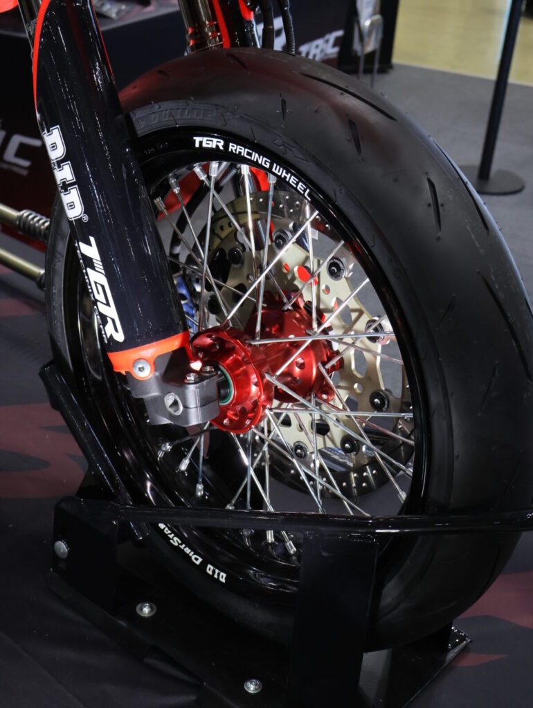 テクニクスのサスペンション周りのカスタマイズでは、前後のサスペンションを17インチホイールを履いたスーパーモタード向けにリセッティングを行い最適化。ブレーキに関しても、純正のマスター&キャリパーを使いながらローター径をアップしてコントロール性を向上させることを推奨している。またホイールに関しても、同社の提案する『TGR RACING WHEEL for Super Motard TYPE-R』には、単にサイズを17インチ化するだけでなくスーパーモタードに必要なホイールの剛性アップのためにハブのスポークレイアウトを最適化する工夫が盛り込まれている。