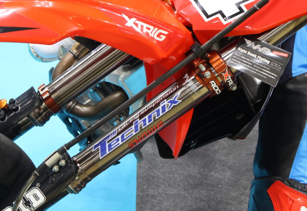 東京モーターサイクルショーブースでは、トレールバイクベースとモトクロッサーベースの両面から、スーパーモタード化したマシンを展示しサスペンション周りの最適化の重要性を提案。同時にフリクションロスの低減とドレスアップ効果が見込めるインナーチューブ&アウターチューブに施す低フリクションコーティングも展示。この低フリクションコーティングには、従来からのDLCコーティング、チタンコーティングなどに加え、さらなるドレスアップ効果が見込める『Night Hawk Plating』を2023年の新作として紹介。このほか、モンキーやZX-25Rなどの小排気量向けのフロントフォークカートリッジキット『テクニクス アドバンスド スマートカートリッジ』も展示して人気を集めていた。