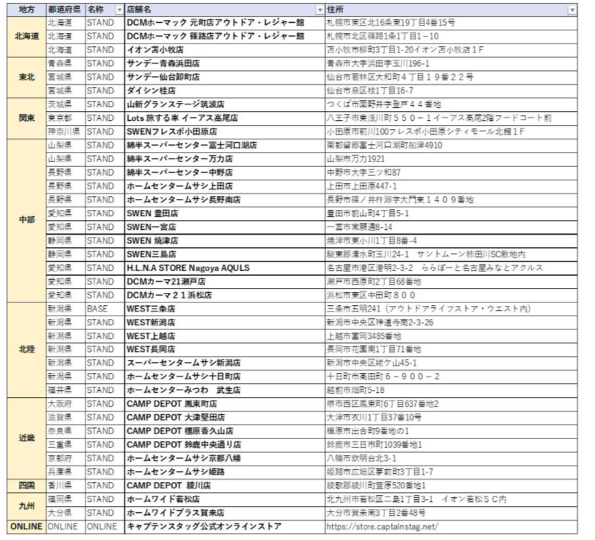 CAPTAIN STAG STAND 店舗一覧