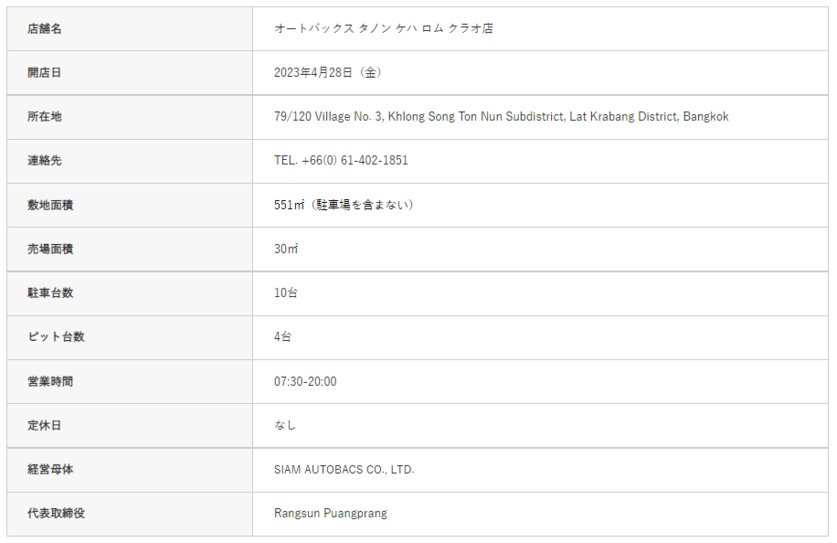 株式会社オートバックスセブン(代表取締役 社長:堀井勇吾)とタイ国内におけるエリアフランチャイズ契約を締結しているSIAM AUTOBACS CO., LTD.(代表取締役社長:Rangsun Puangprang)は、2023年4月28日(金)に「オートバックス タノン ケハ ロム クラオ店」を新規オープンいたしました。