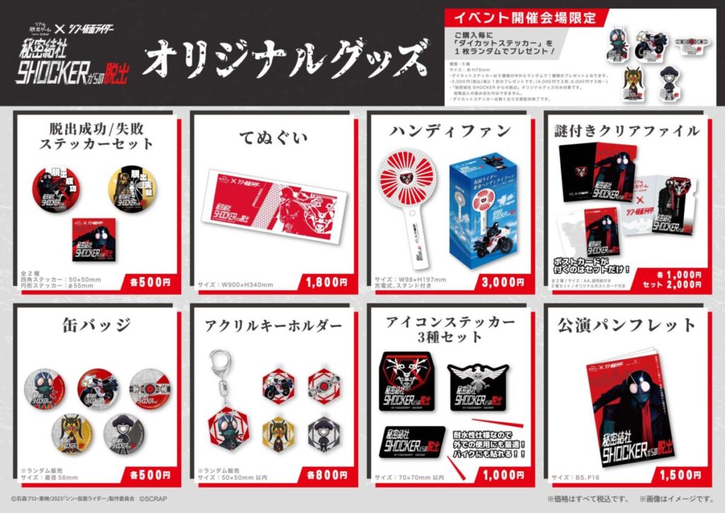 株式会社SCRAP(所在地:東京都渋谷区、代表社員:加藤隆生)は、映画『シン・仮面ライダー』とコラボレーションした、リアル脱出ゲーム『秘密結社SHOCKERからの脱出』の、イベントオリジナルグッズ情報を発表いたします。