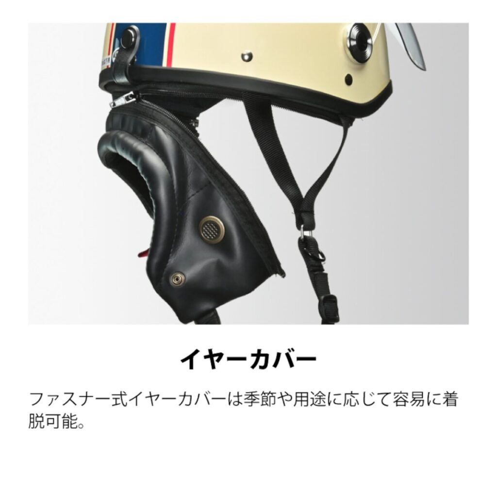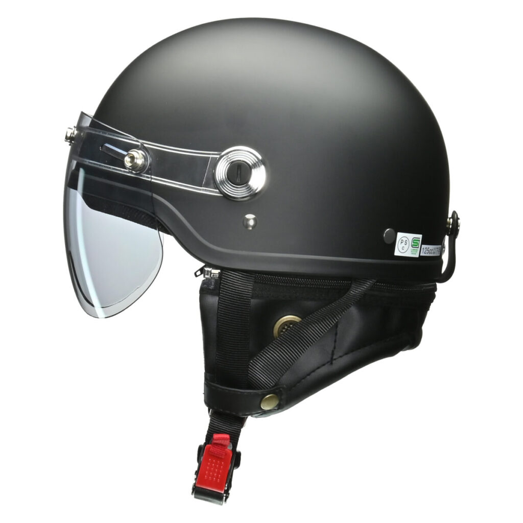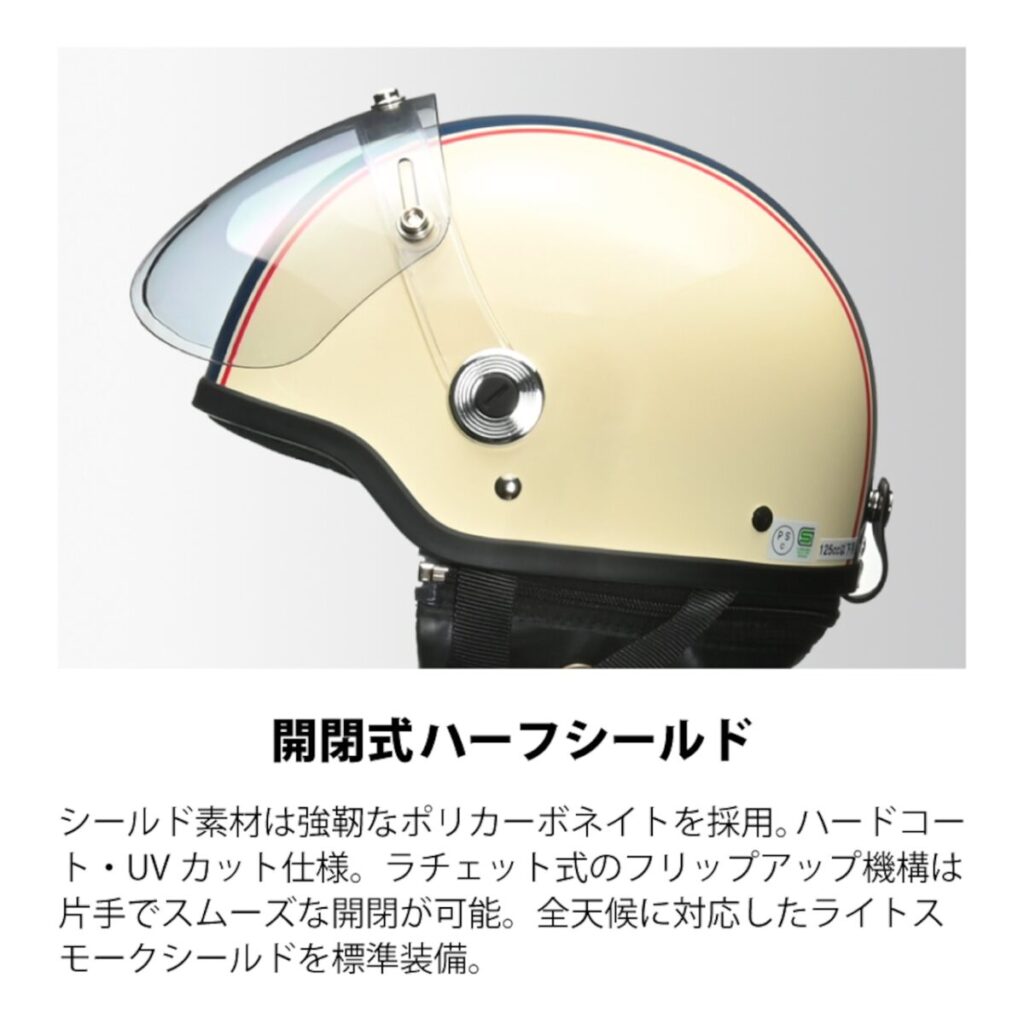 イヤーカバー付きハーフヘルメットに開閉式のハーフシールドを装備したモデル。ハーフシールドの素材は強靭なポリカーボネイトを採用。ハードコート・UVカット仕様。全天候に対応したライトスモークシールドを標準装備。