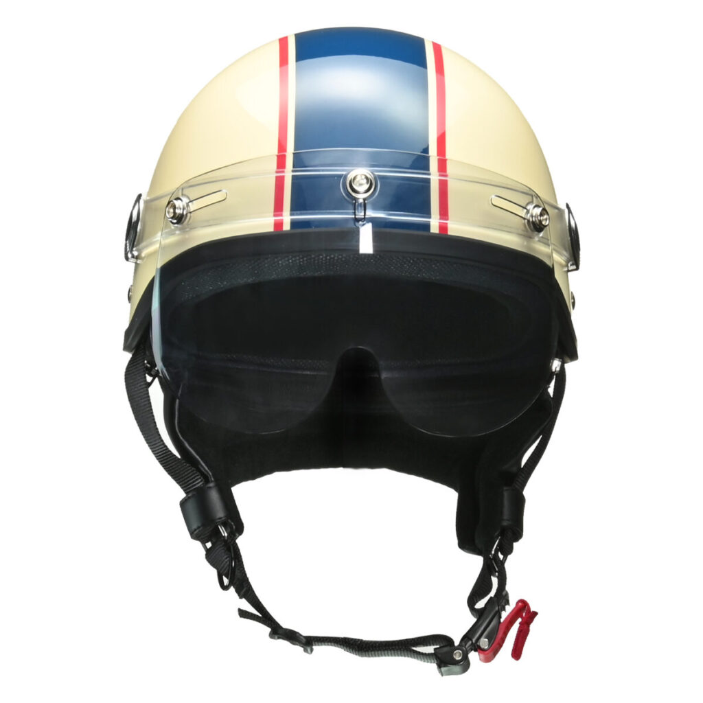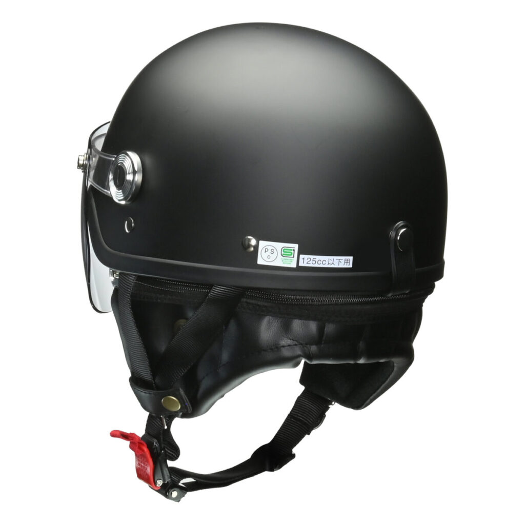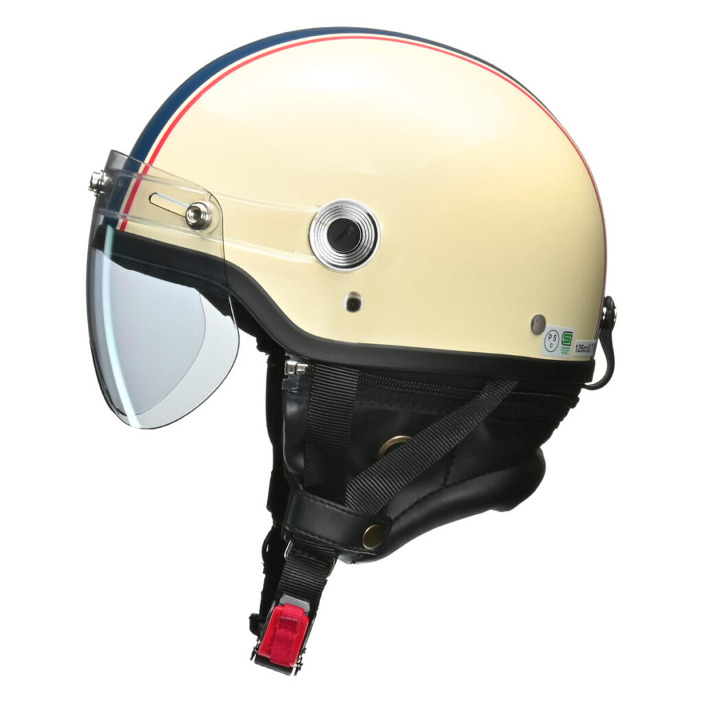 イヤーカバー付きハーフヘルメットに開閉式のハーフシールドを装備したモデル。ハーフシールドの素材は強靭なポリカーボネイトを採用。ハードコート・UVカット仕様。全天候に対応したライトスモークシールドを標準装備。
