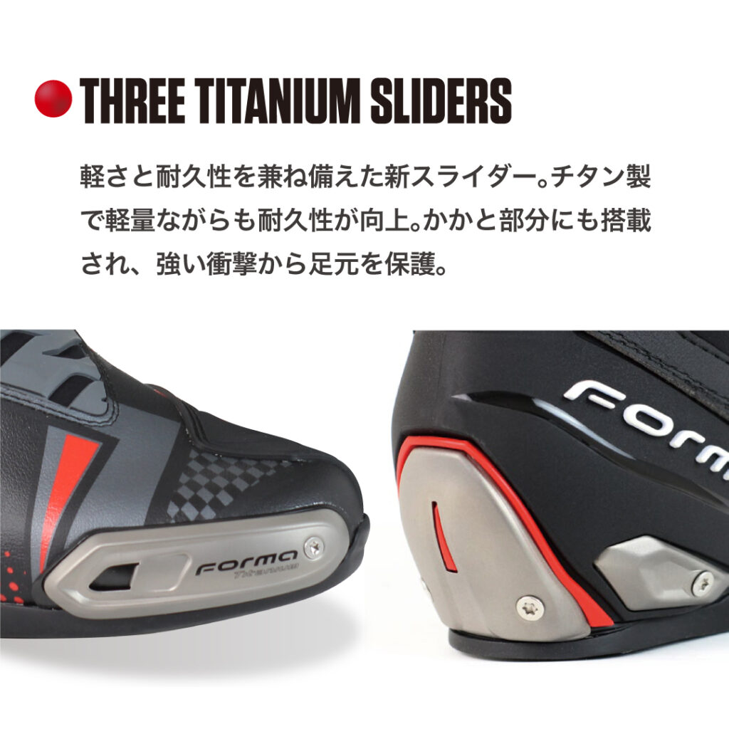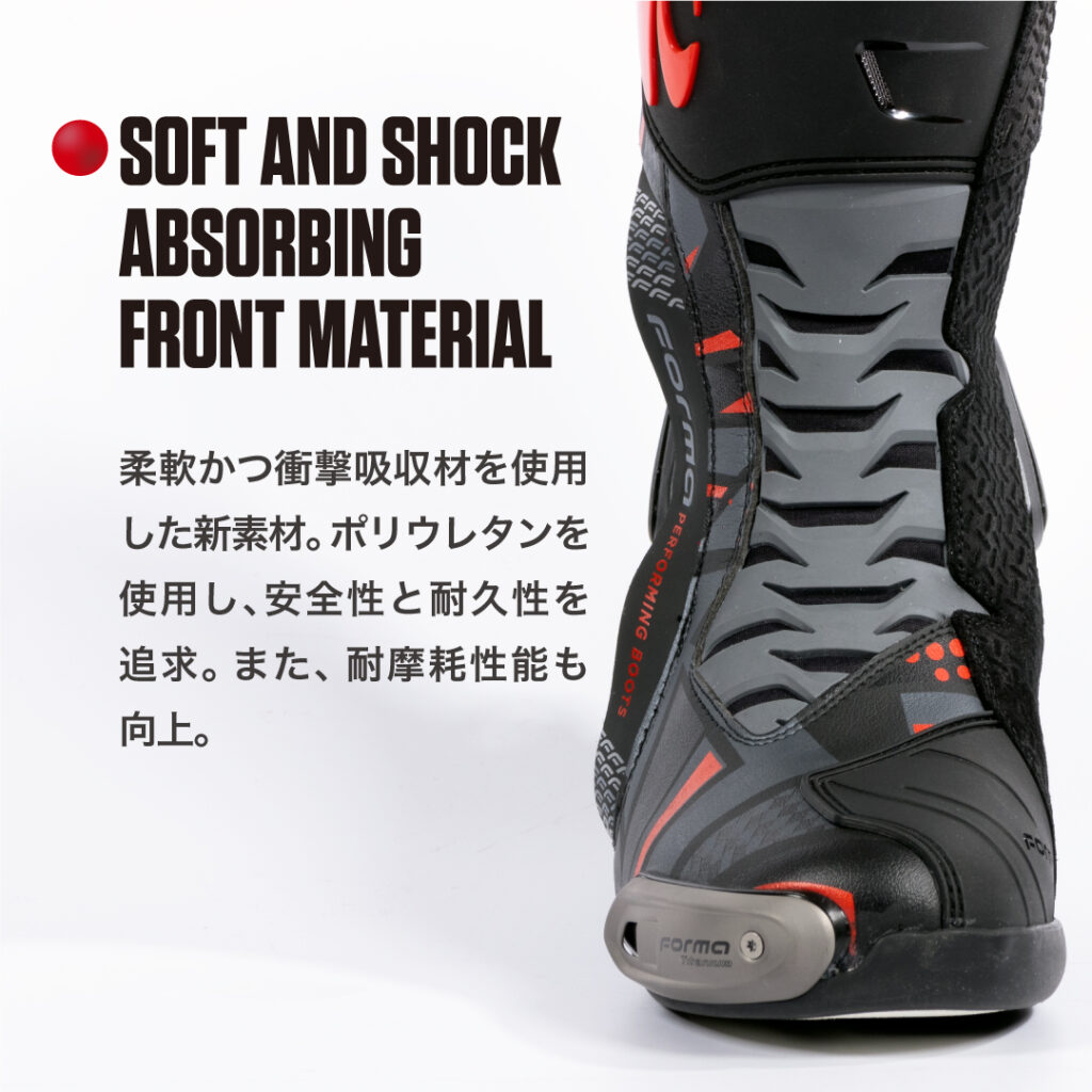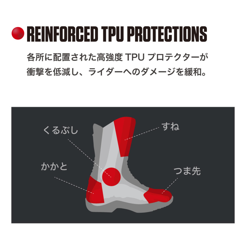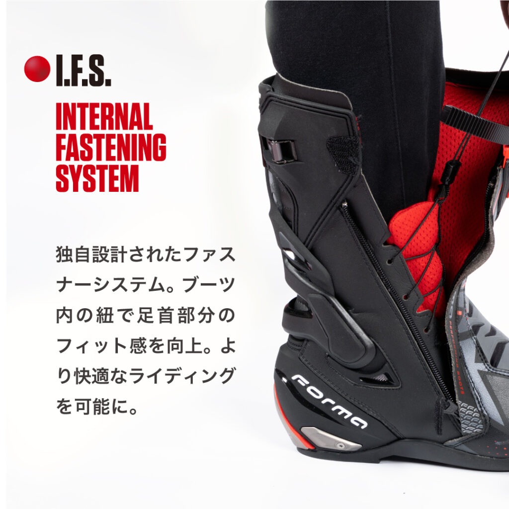 また、独自設計されたファスナーシステムである、I.F.S(INTERNAL FASTENING SYSTEM)はブーツ内の紐で足首部分のフィット感を向上。より快適なライディングを可能にします。