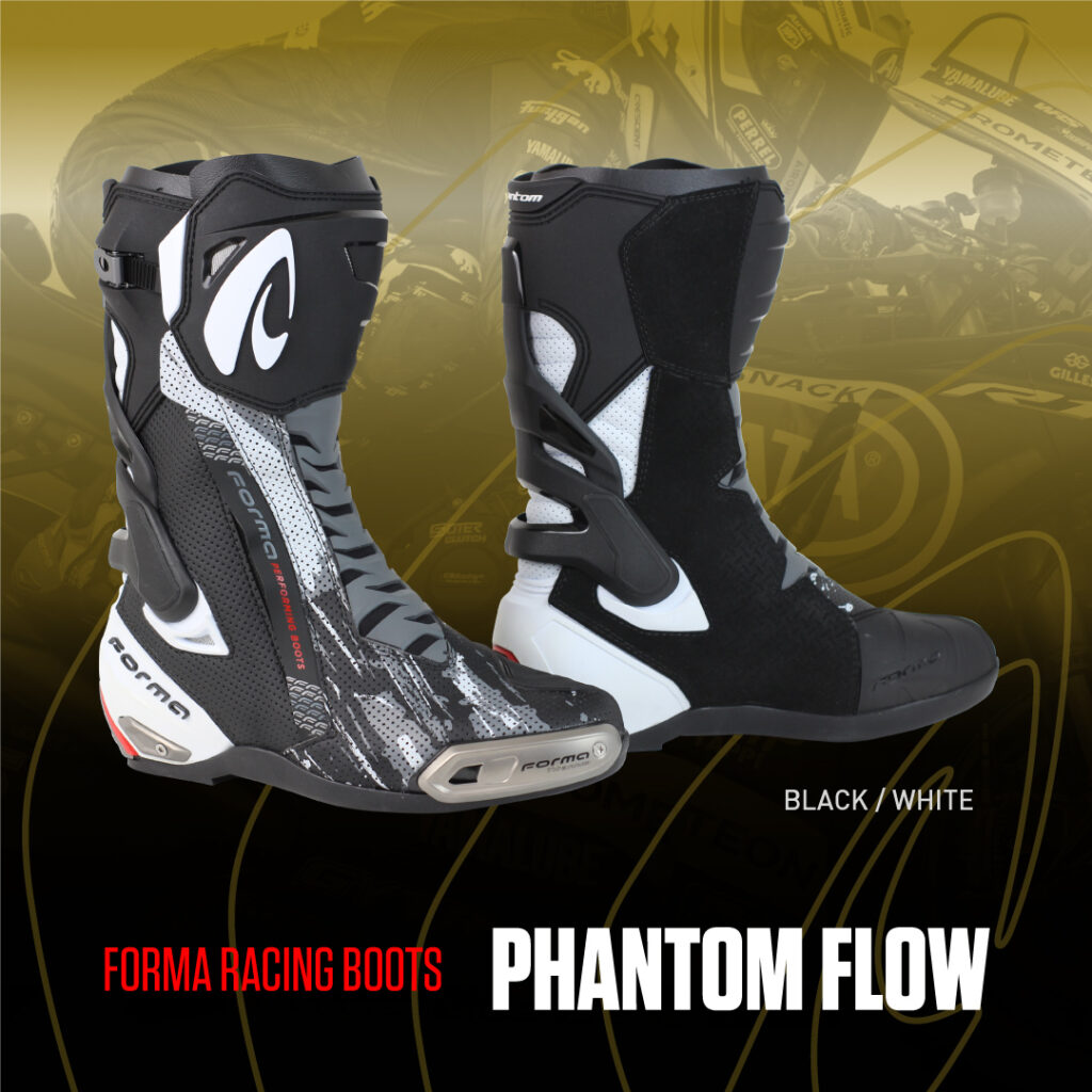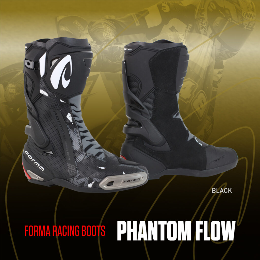 岡田商事株式会社は、MotoGPライダーも着用するFormaのハイエンドモデル、PHANTOM(ファントム)とPHANTOM FLOW(ファントムフロー)を発売した。最先端技術であるV.F.Sを搭載し、機能性と安全性を向上。また、独自設計したファスナーシステムI.F.Sにより、ブーツ内の紐で足首部分をフィットさせることで快適なライディングを実現している。さらに、チタニウムスライダーを採用し、ブーツ全体の軽量化にも成功。ブーツ工場として約40年間培ってきた技術が存分に組み込まれた、レースシーンに最適なブーツとなっている。価格は69,850円(税込)だ。