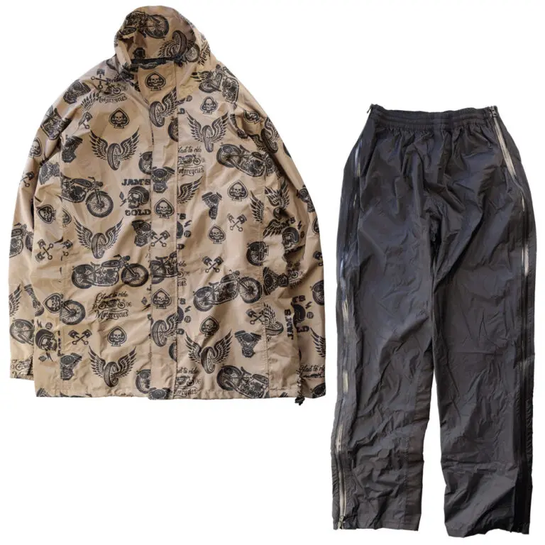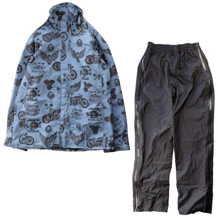 バイク用レインウェアの特徴でもあるパンツ部分はブーツを脱がずに履けるフルジップ仕様、右足内側はヒートガードを装備。また、タウンユースにも便利なレインハットも付属している。JAM’S GOLDらしいバイクの総柄デザインもポイント。