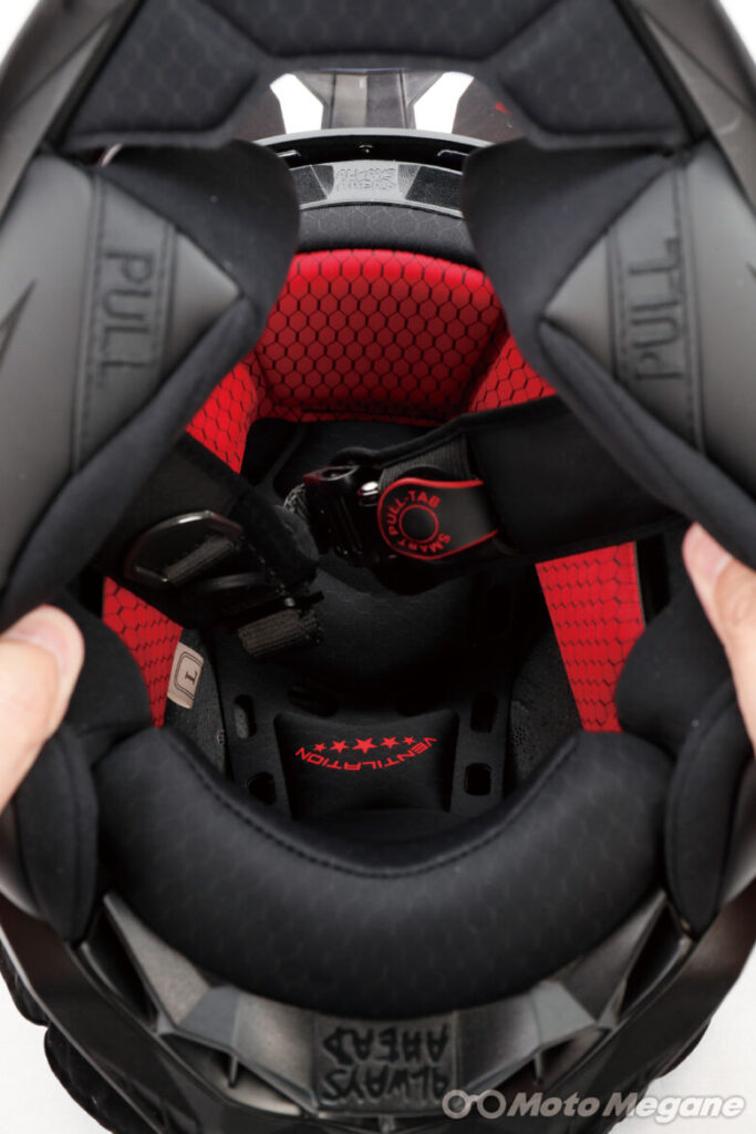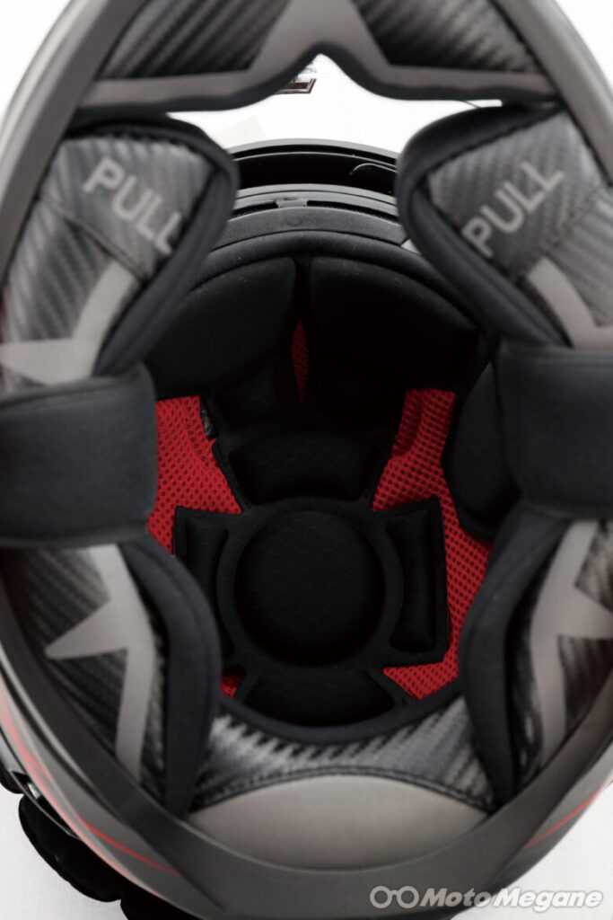 内装には走行中のヘルメット内部湿度を快適に保つために吸湿性のある低刺激の生地を使用している。