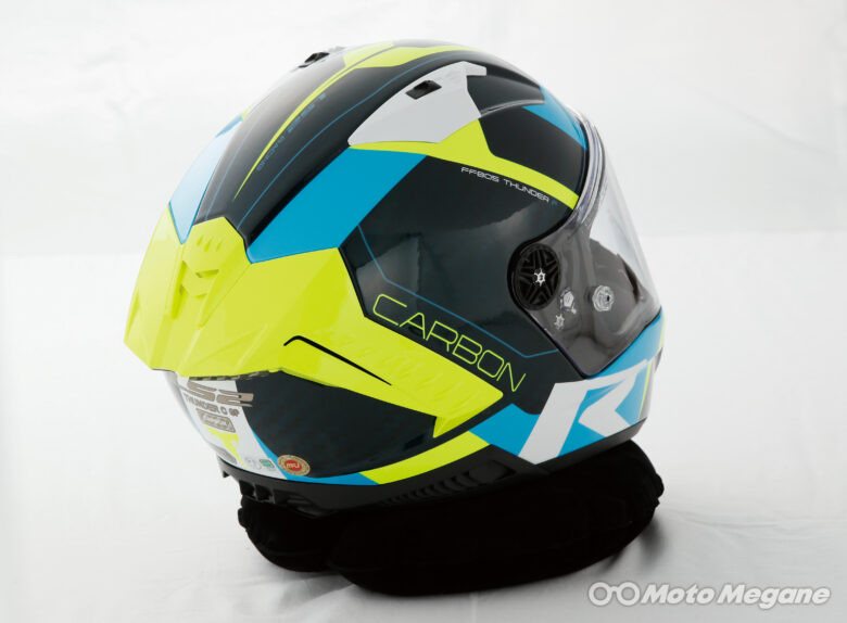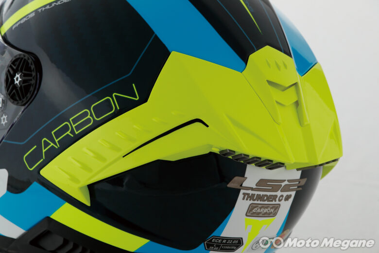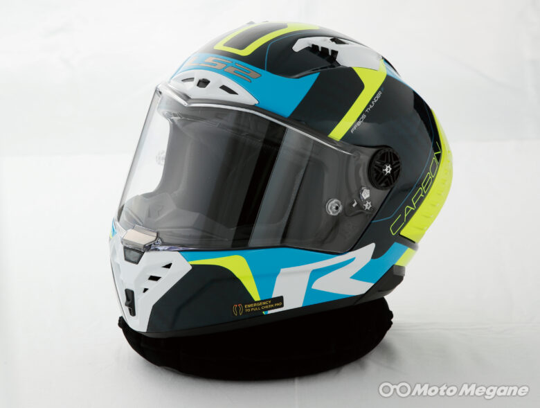 従来のLS2スポーツモデルの特徴であった広い視野角、空力特性を中心にさらに性能を向上。カーボンファイバーを帽体に採用し、基準の中で可能な限り軽量化を行っている。ダブルDリング式のアゴ紐、ナイロン糸に純銀をコーティングしたX-Staticを内装生地に採用。軽量でなおかつ快適な着用感を実現している。またTHUNDER C GPの頭周は、日本人の骨格に比較的近い形状となっているのも特徴だ。