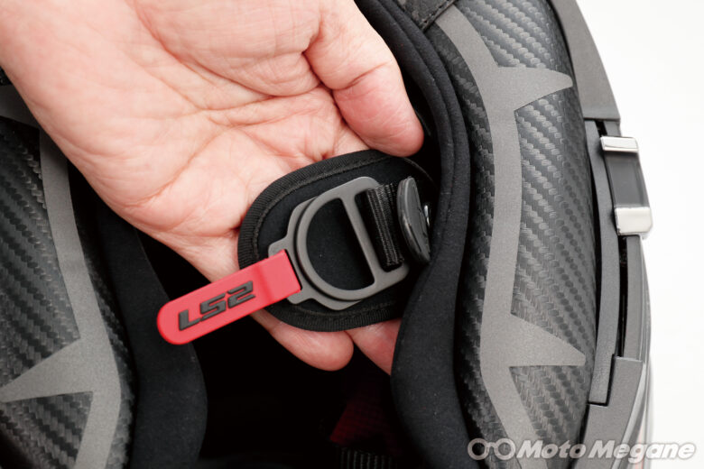 アゴ紐には、紐を折り返して締めるダブルDリングタイプを採用した。