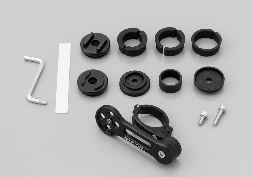 はめ合い面積を25%強くした【SPC+】マウントを採用したオールインワンセット。取り付けに必要なパイプハンドルにクランプするマウントと、フォンケース、ウェザーカバーが全て入っているので、すぐに使用できます。航空機に使用されるアルミ合金からCNC切削加工で削り出したマウントには、SP CONNECT独自の振動減衰システム(※1)を採用しています。付属のアタッチメント(φ22.2/25.4/28.6/31.7mm)で、様々な径のハンドルに取り付けが可能。