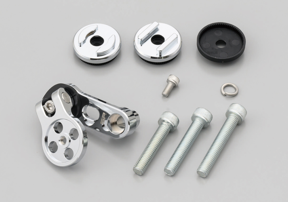 セパレートハンドル車にSPコネクトを装着できるステムマウント。ステムホールが空いたセパレートハンドル車専用。航空機に使用されるアルミ合金からCNS切削加工で削り出したマウントには、SP CONNECT独自の振動減衰システム(※1)を採用しています。ステンレスボルト使用。