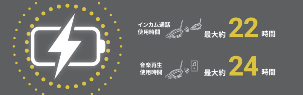 連続使用時間インカム通話 最大約22時間携帯通話、音楽再生 最大約24時間 (それぞれ単体での稼働の場合)