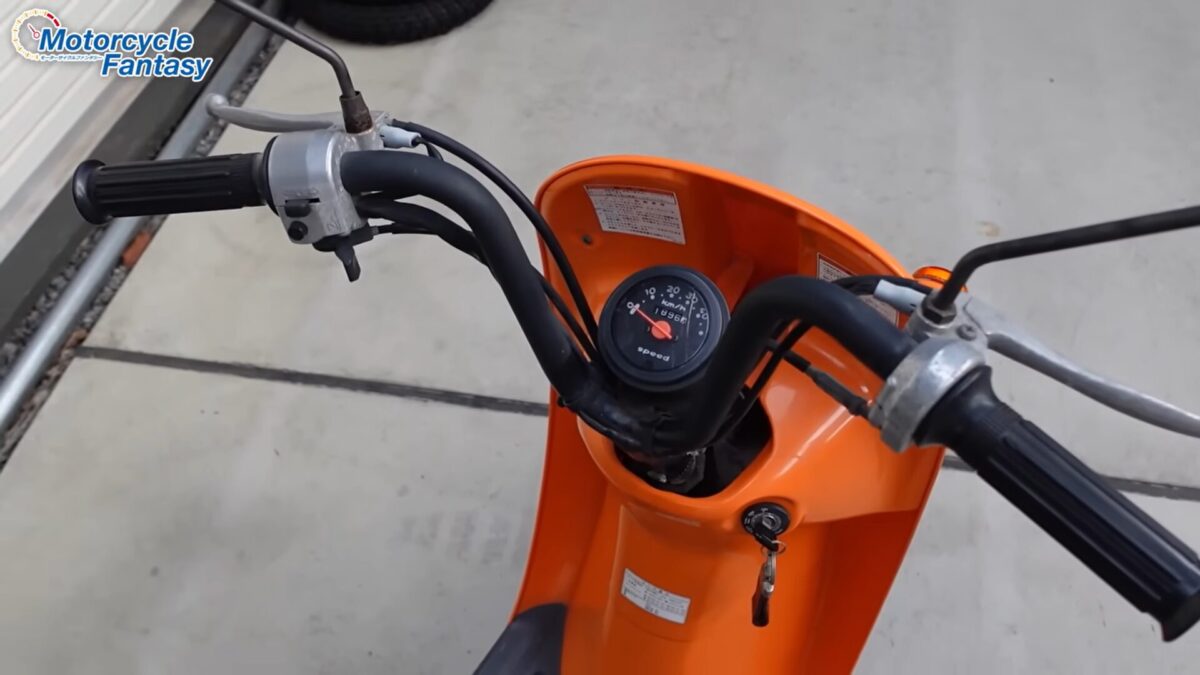 初期型はスピードメーターだけで距離計はついていません。速度は50km/hまでしか表示されませんが、最高速度は45km/h程度なので、これで十分です。