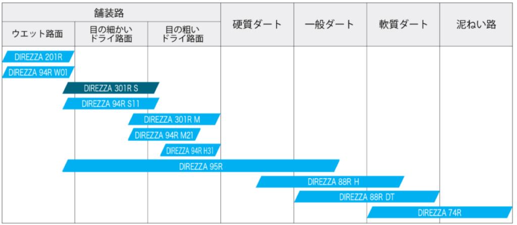「DIREZZA 301R S」は、舗装路面におけるラリー競技での上位入賞を目標に開発したハイグリップタイヤで、特に目の細かいドライ路面での使用に適しています。非対称パターンと専用コンパウンドの採用によって、グリップ性能と耐摩耗性能の高次元での両立を実現しています。