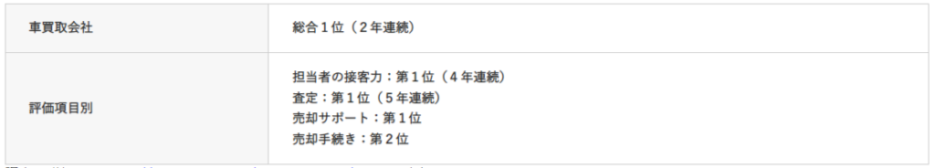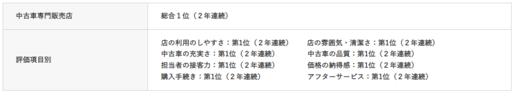 ・項目別では「店の利用のしやすさ」「店の雰囲気・清潔さ」「中古車の充実さ」「中古車の品質」「担当者の接客力」「価格の納得感」「購入手続き」「アフターサービス」の全8項目で1位に選出されました