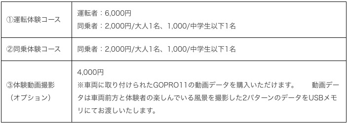 お客様に運転いただける「①運転体験コース(初級・中級)」と、インストラクターが運転し同乗