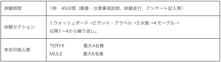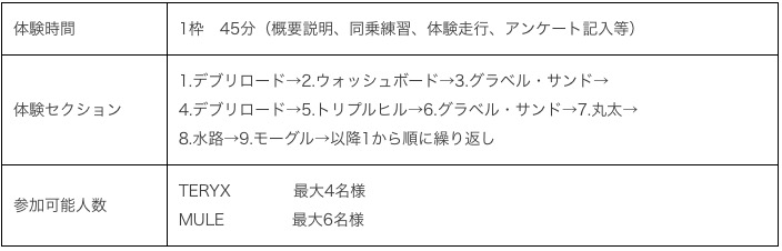 走行をお楽しみいただける「②同乗体験コース」の2コースをご用意し、ご家族やご友人と共に楽