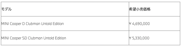 ビー・エム・ダブリュー株式会社は、ハイ・グレードな装備を施した特別仕様車「MINI Clubman Untold Edition」を、全国のMINI正規ディーラーにおいて、販売を開始した。イギリスのプレミアム・ブランド「MINI」のラインナップの中でも「MINI Clubman」は、繊細なクラフトマンシップや、モダンでファッショナブルな個性を表現するモデルである。価格は、MINI Cooper D Clubman Untold Editionが4,690,000円、MINI Cooper SD Clubman Untold Editionが5,330,000円(いずれも税込)となっている。納車は、本年9月以降を予定している。