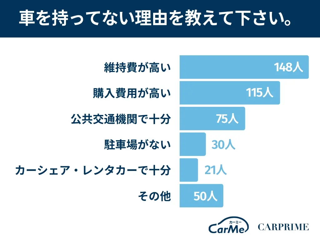 その結果、「維持費が高い」が148名(49.3%)で最多、「購入費用が高い」が115名(38.3%)がそれに次ぐ結果となりました。やはり、金銭面で車の所有を躊躇する方が多いようです。