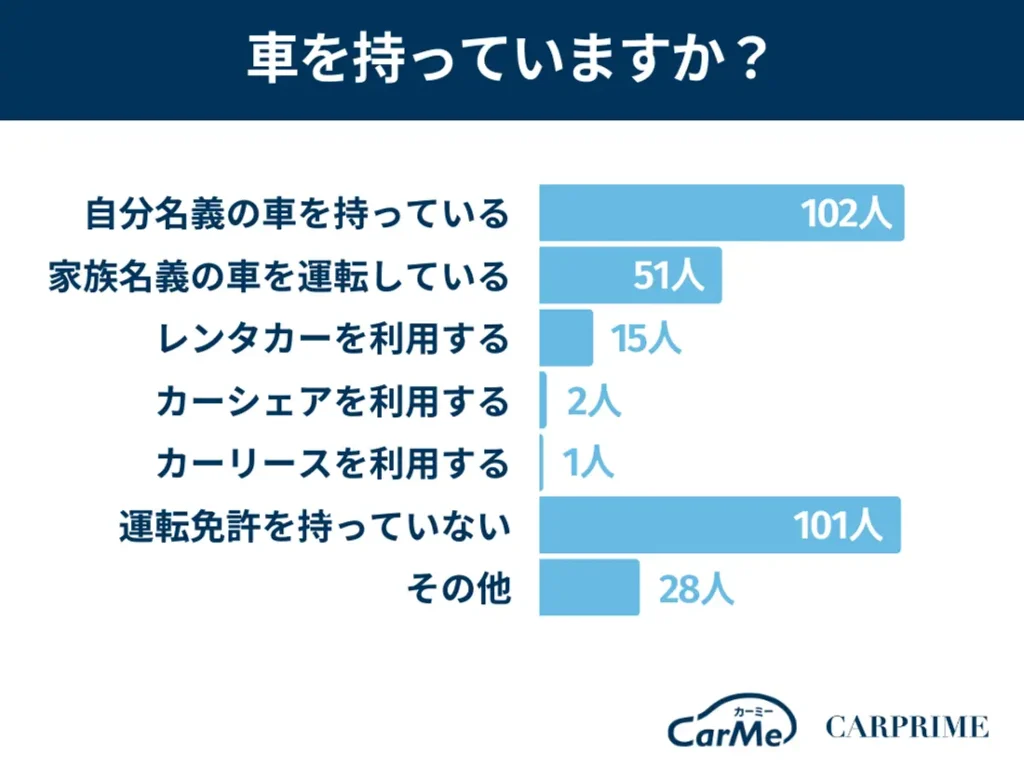 アンケート調査を行った300名のうち、車を持っている人は153名(51%)でした。このうち、自分名義で車を持っている人は102名(34%)、家族名義で車を持っている人は51名(17%)という結果になりました。