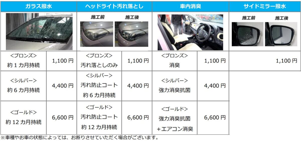 同サービスは、ガラス撥水、車内消臭、ヘッドライト汚れ落とし、サイドミラー撥水の4つのカテゴリーで、ユーザーのニーズに合わせた10メニューを1,100円の低価格から展開している。また、機能や効果の持続に応じた4,400円、6,600円のランクアップメニューを用意し、幅広いニーズにも対応しているのも特徴的だ。定期的なメンテナンスの際に活用してみてはいかがだろうか。