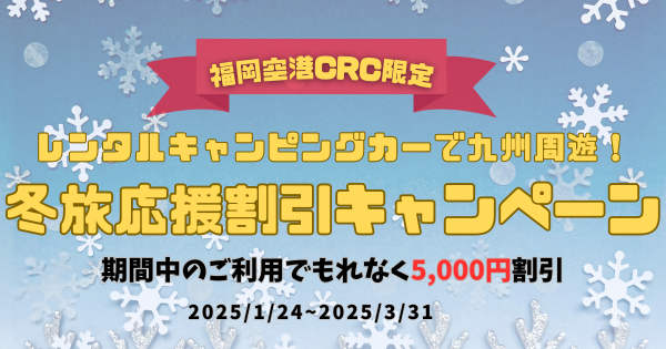 国内レンタルキャンピングカー大手「ジャパンキャンピングカーレンタルセンター(以下 JAPAN C.R.C.)「https://japan-crc.com/」を運営するキャンピングカー株式会社(本社:東京都渋谷区、代表取締役社長:頼定 誠)は福岡空港キャンピングカーレンタルセンター(福岡空港C.R.C.)利用者限定で2025年1月25日(土)~2025年3月31日(月)の期間での出発・返却のご利用が5,000円割引となる『冬旅応援割引キャンペーン』を実施いたします。