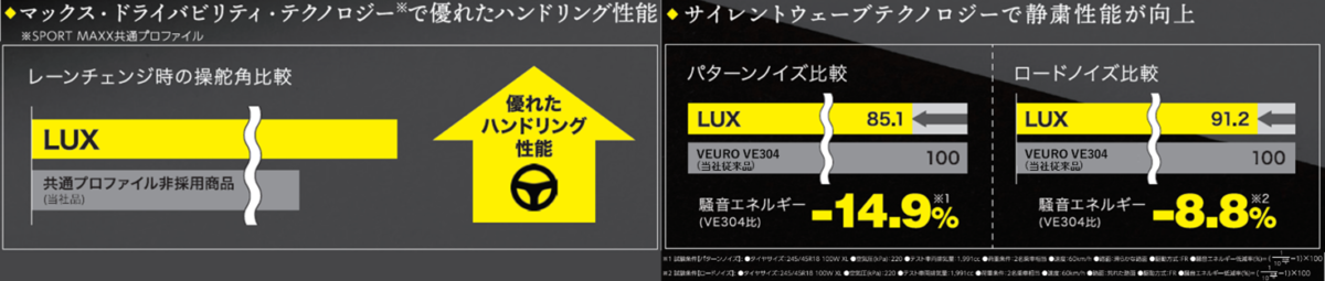 同製品は、SPORT MAXX専用特殊プロファイル「マックス・ドライバビリティ・テクノロジー」により、広くなった接地面で路面を捉えることが可能になり、操縦安定性能が向上している。また、最新のノイズ低減技術「サイレントウェーブテクノロジー」によって、当社従来品「VEURO VE304」比でパターンノイズは14.9%低減、ロードノイズは8.8%低減しているのも特徴だ。興味のある方は詳細をチェックしてみてはいかがだろうか。