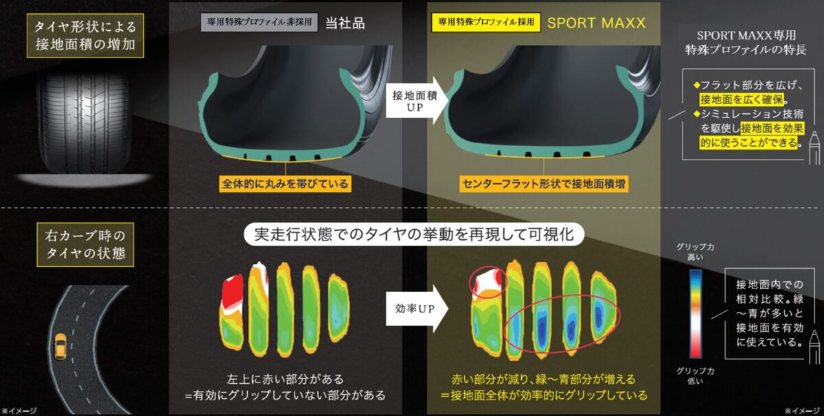 SPORT MAXX専用特殊プロファイル「マックス・ドライバビリティ・テクノロジー」搭載によって、広くなった接地面で路面を捉えることが可能になり、操縦安定性能が向上します。同プロファイル非採用品と比べ、カーブ走行時により小さな舵角で思い通りの走行が可能になります。