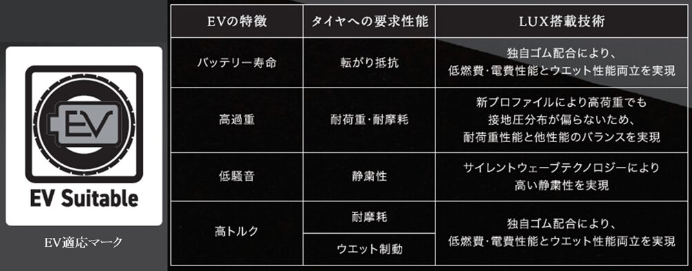 FALKEN(ファルケン)「e. ZIEX(イージークス)」*1、DUNLOP「e. SPORT MAXX(イースポーツマックス)」*2などのEV専用タイヤやEV新車装着タイヤの開発で培った技術を展開して開発しました。ガソリン車だけでなくEVに求められる必要要件も満たしたとして、DUNLOPで初めてタイヤ側面に「EV適応マーク」を刻印。DUNLOPでは、転がり抵抗性能・耐荷重性能・耐摩耗性能・静粛性能・ウエットグリップ性能を高い基準でクリアしたタイヤのみが刻印することができる「EV適応マーク」を制定しました。