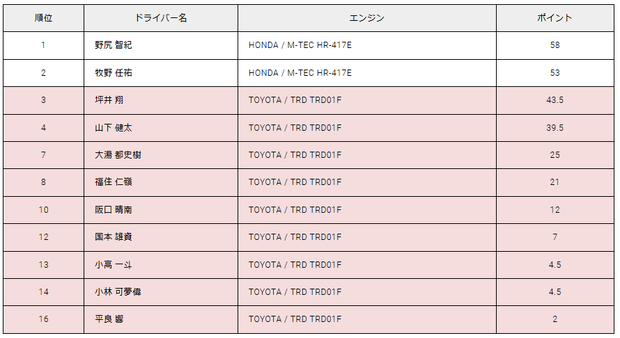 この勝利で3戦連続表彰台となった坪井はランキングでも2位へと浮上。山下、大湯、福住もランキング上位につけており、他のTGR勢も含めて後半戦の戦いに期待がかかりました。