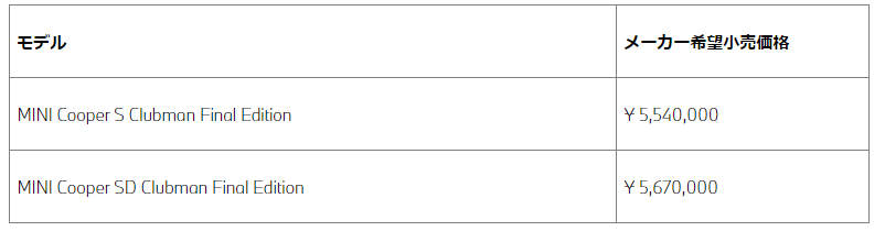- 320台限定の内訳は、外装色がエニグマティック・ブラックのMINI Cooper S Clubman Final Editionが60台、外装色がナノク・ホワイトのMINI Cooper S Clubman Final Editionが40台、外装色がエニグマティック・ブラックのMINI Cooper SD Clubman Final Editionが140台、外装色がナノク・ホワイトのMINI Cooper SD Clubman Final Editionが80台になる予定です。
