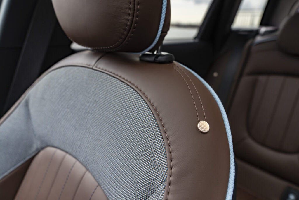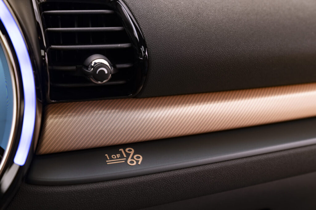 限定車MINI Clubman Final Editionのインテリアは、ショルダー部にエディション・バッジを備えたMINI Yoursレザー・シートを特別に装備している。シートは、Final Edition専用のダーク・マルーンで仕上げられ、ブルーのコントラスト・ステッチがスタイリッシュなアクセントを添えている。また、シートには、運転席メモリー機能付きの電動シートおよびシート・ヒーターを備え、MINI Clubman最後の限定車にふさわしい装備内容としている。インテリア・トリムにも、専用色となるシマー・コッパーをアクセントに採用し、インテリア全体を落ち着いたブラウン・トーンに統一させている。マットなセージ・グリーンとシマー・コッパーのトリム・ストリップが調和したインテリア・サーフェスは、 助手席側に「1 of 1969」のバッジを配し、Final Editionのエクスクルーシブな室内空間を実現している。特別装備のナッパ・レザー・ステアリングのスポーク下部およびフロント側のドア・シルには「Final Edition」のレタリングを入れ、リア側のドア・シルには「1 of 1969」のレタリングが施されている。さらに、フロア・マットには、銅貨を連想させる「1 of 1969」のロゴを入れたピン・バッチを取り付け、車両キーには、アクセント・カラーに合わせたシマー・コッパーが用いられ、専用のグラフィック・パターンと「1 of 1969」ロゴが立体的にデザインされている。