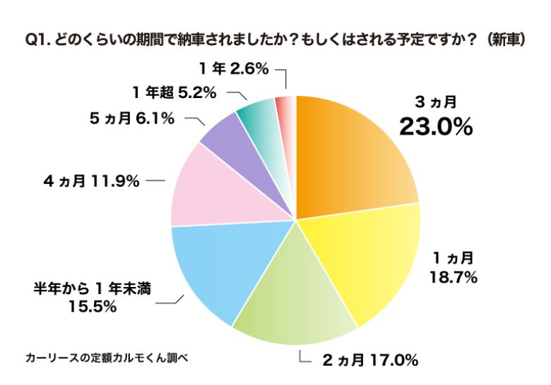 - 納車されるまでの期間は新車で「3ヵ月」、中古車で「1ヵ月」が最多