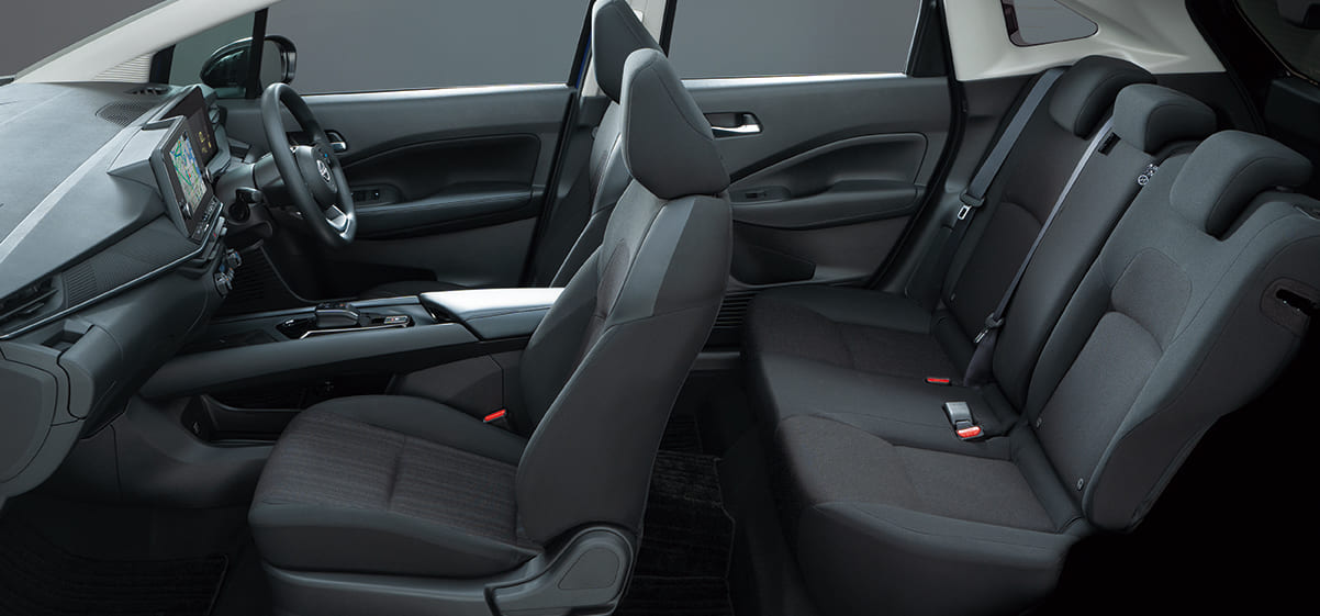新型ノートのインテリアは、インストルメントパネルに水引をモチーフにしたデザインを採用し、シート地にランダムストライプを施すことで、エクステリアと調和した雰囲気に仕上げられています。