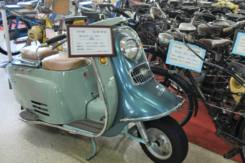 2014(平成26)年に社名を「スバル」に改称した富士重工もバイクを製造していました。1917(大正6)年に、中島知久平(元海軍機関大尉)によって設立された民営の飛行機研究所を前身とし、戦後は航空機製造技術を活かして「富士重工業」として再スタートしました。ラビットは富士重工のスクーターブランドで、ラビットスーパーフローS601は、1966(昭和41)年に発売されました。