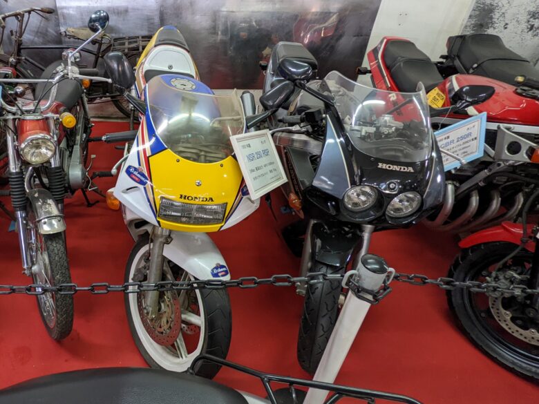 1980年代中期にバイクブームを支えた二枚看板です。「NSR250R SP」は、1993(平成5)年に発売された二輪館の中で最も新しいバイクです。NS250Rのフルモデルチェンジ車として1986(昭和61)年に登場。水冷2ストローク90°V型2気筒、最高出力45馬力(展示モデルは40馬力)を発揮しました。4代目となるこのMC28はNSRの最終型で、スタンダードの他に、乾式多板クラッチや前後サスペンションに減衰力調整機構を装備した「SE」、SEをベースに、マグテックホイールを装着し、フロントサスペンションにニュー・カートリッジタイプを装備した「SP」をラインアップしていました。