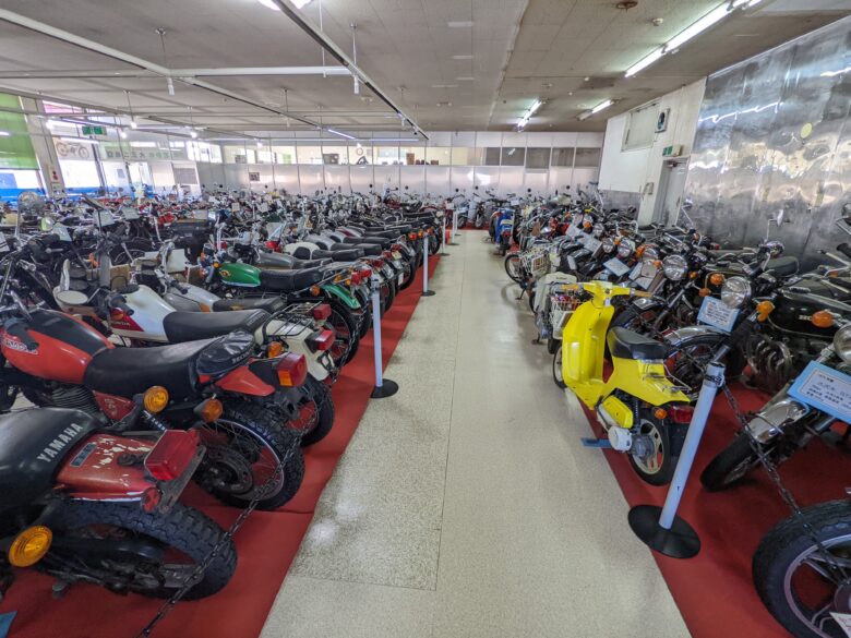 恐る恐るドアを開けると、倉庫らしき空間に、所狭しとバイクが並んでいます。いわゆる「名車」ではなく、クラッシックというか、ビンテージというか、古いというか、ボロいというか、その類がゴロゴロ。なかなかお目にかかれない逸品が揃っています。