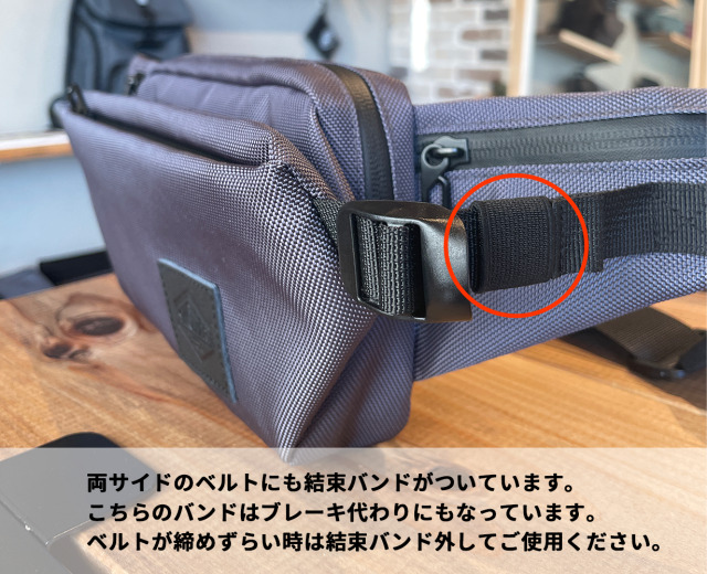 ベルト調整が瞬時にでき、余ったベルトは結束バンドでまとめられる。ベルトがぶらぶらしないからライディング時のジャマにならない!