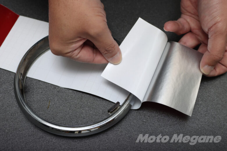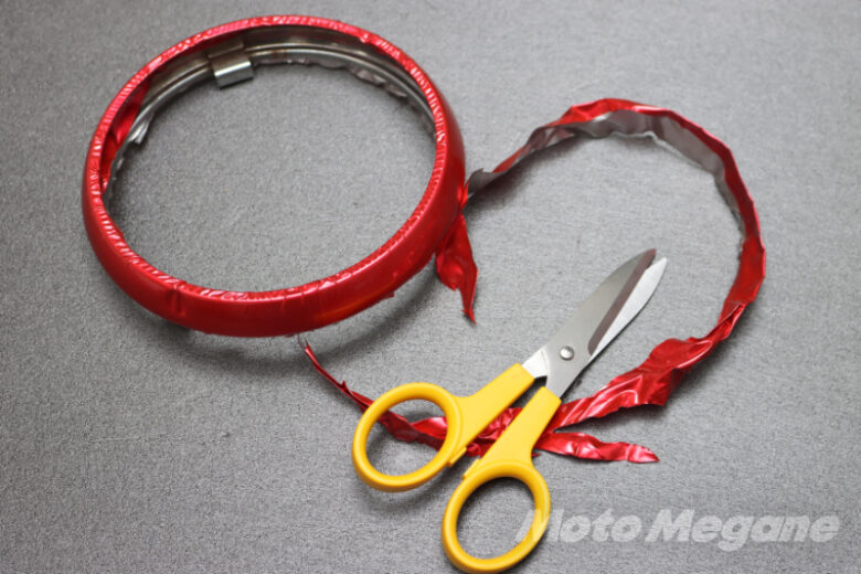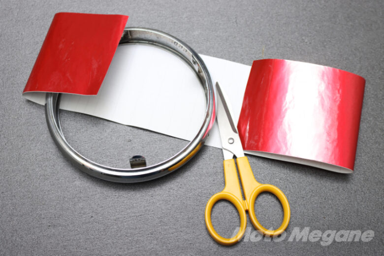 このヘッドライトリムに貼ってみることにしました。ちょっと曲面が多過ぎたので、結果的には少し失敗ました。