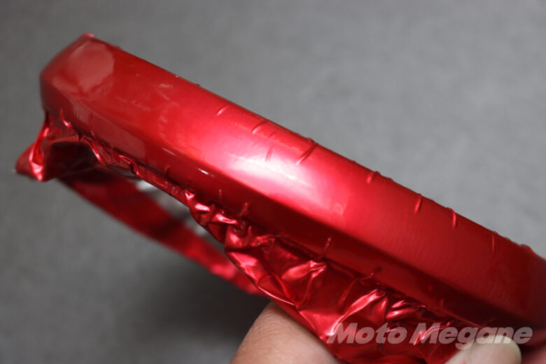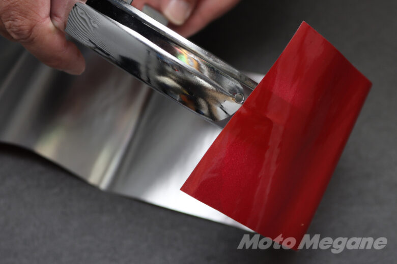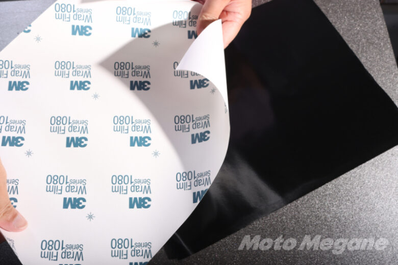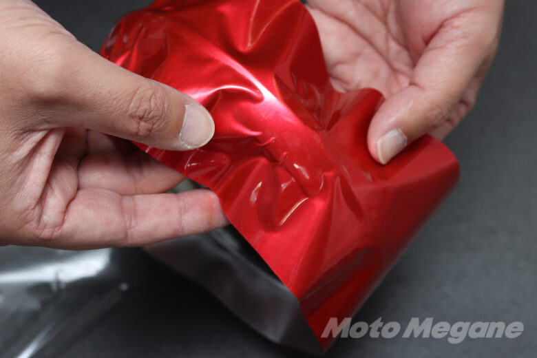 ラッピングフィルムは、バイクや車の3次曲面に伸びて追従するので、まるで塗ったように綺麗に貼ることができる商品。