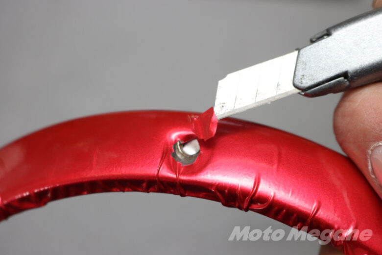 まずもってリム全周にフィルムを回すように貼りました。ラッピングフィルムは何度でも貼り直しができるので、わりと気楽に取り組めます。