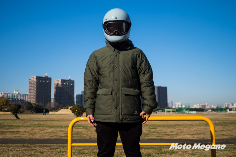 防寒性に関してはバイク業界で流行りのインナー脱着式を採用している。私は普段Sサイズを着用しているが、お借りしたのはLサイズにも関わらず全体的なシルエットは細身に見える。オリジナルのモンスターパーカーはダボダボのシルエットで半端じゃない中綿量が入っているので、TAICHIのデザイナーがオマージュしつつ全面的にバイク用に作ったという感じなのだろう。