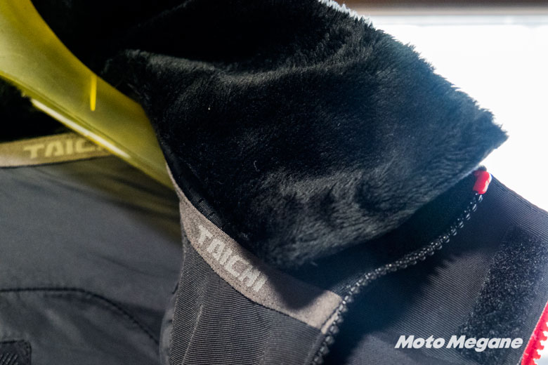 エリが高めに設定されており、内側には脱着可能なファーが付いているのでネックゲーターやマフラーなどは不要だろう。