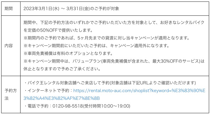 レンタルバイク50%OFFキャンペーン 概要
