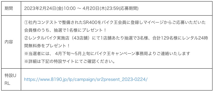 株式会社バイク王&カンパニーは、2023年2月24日(金)から「Re:rideキャンペーン」を実施する。応募期間は2023年2月24日(金)10:00 ~ 4月20日(木)23:59までで、バイク王会員に登録しマイページから応募した方が対象で、賞品は、昨年社内コンテストに出展されたSR400となる。さらに、ダブルチャンスとして129名様に当社レンタル実施店舗でご利用いただけるレンタル24時間無料券を抽選でプレゼントを予定している。