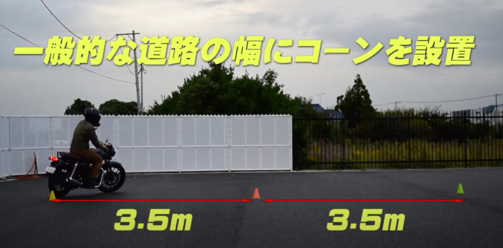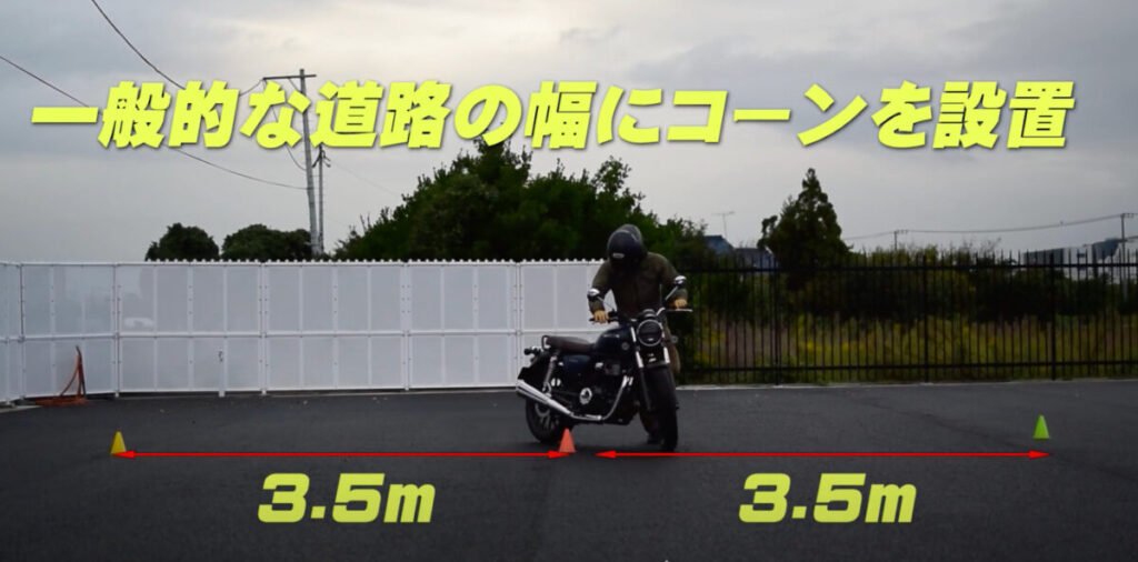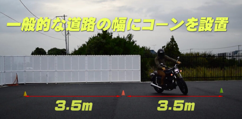コーンを3.5m幅に置いて、GB350の最小回転半径も見ていこう。