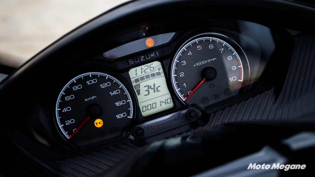 バーグマン400 ABSのメーターはアナログ、デジタルの複合タイプですが燃費計もついています。