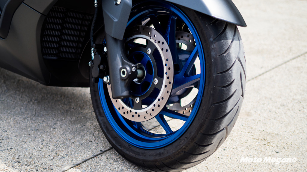 最近の400ccクラスはフロントもシングルディスクブレーキを採用していることが多いですが、バーグマン400 ABSはダブルディスク。