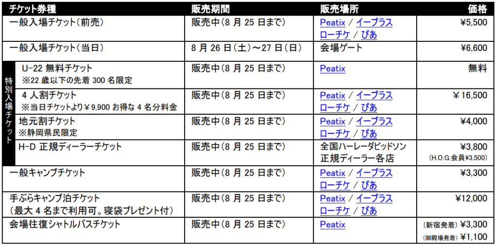 チケット: 下表参照*3。(保護者同伴の)中学生以下は入場無料。 ※各券種とも予定枚数を終了した場合は先行して販売終了します